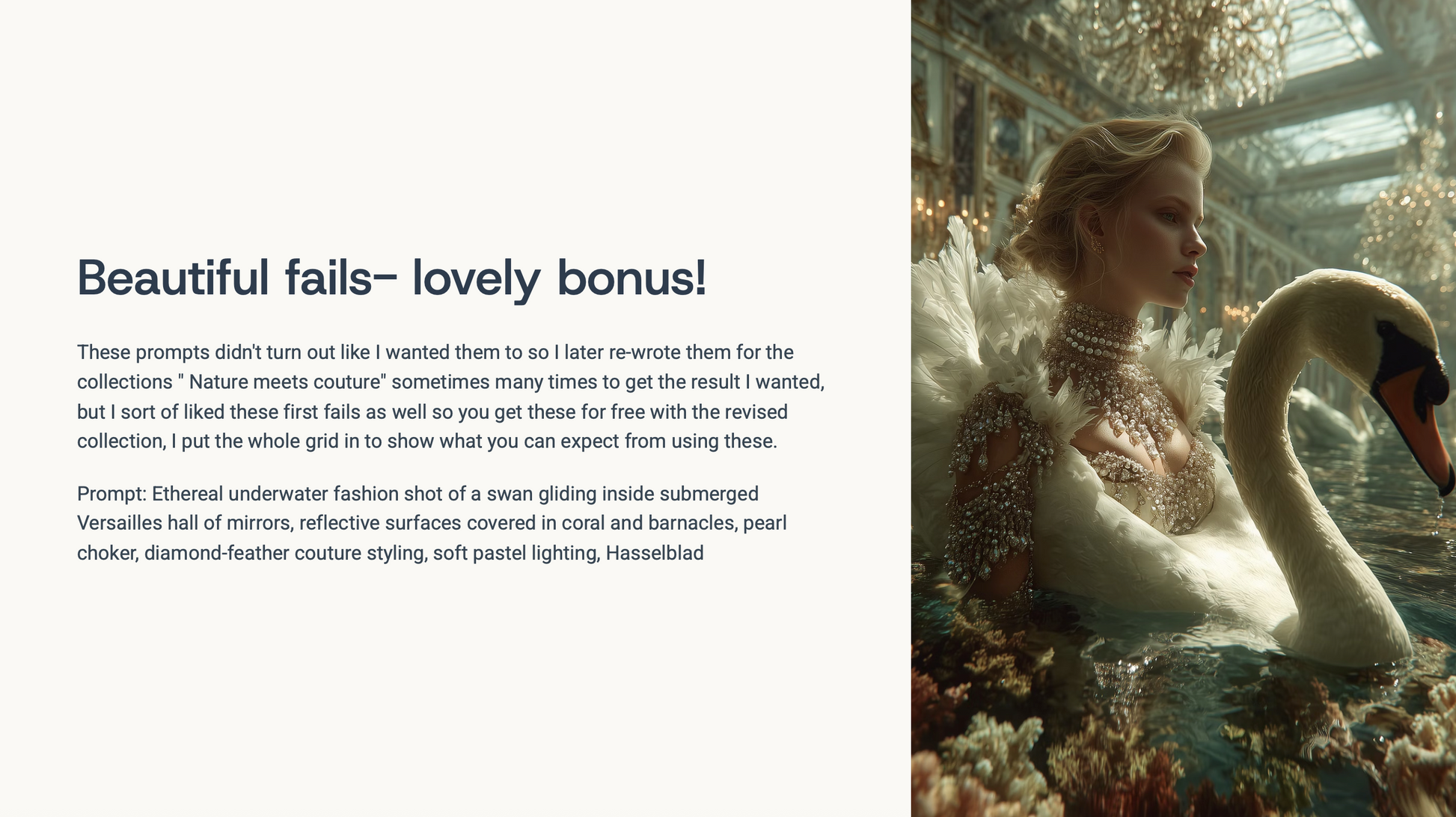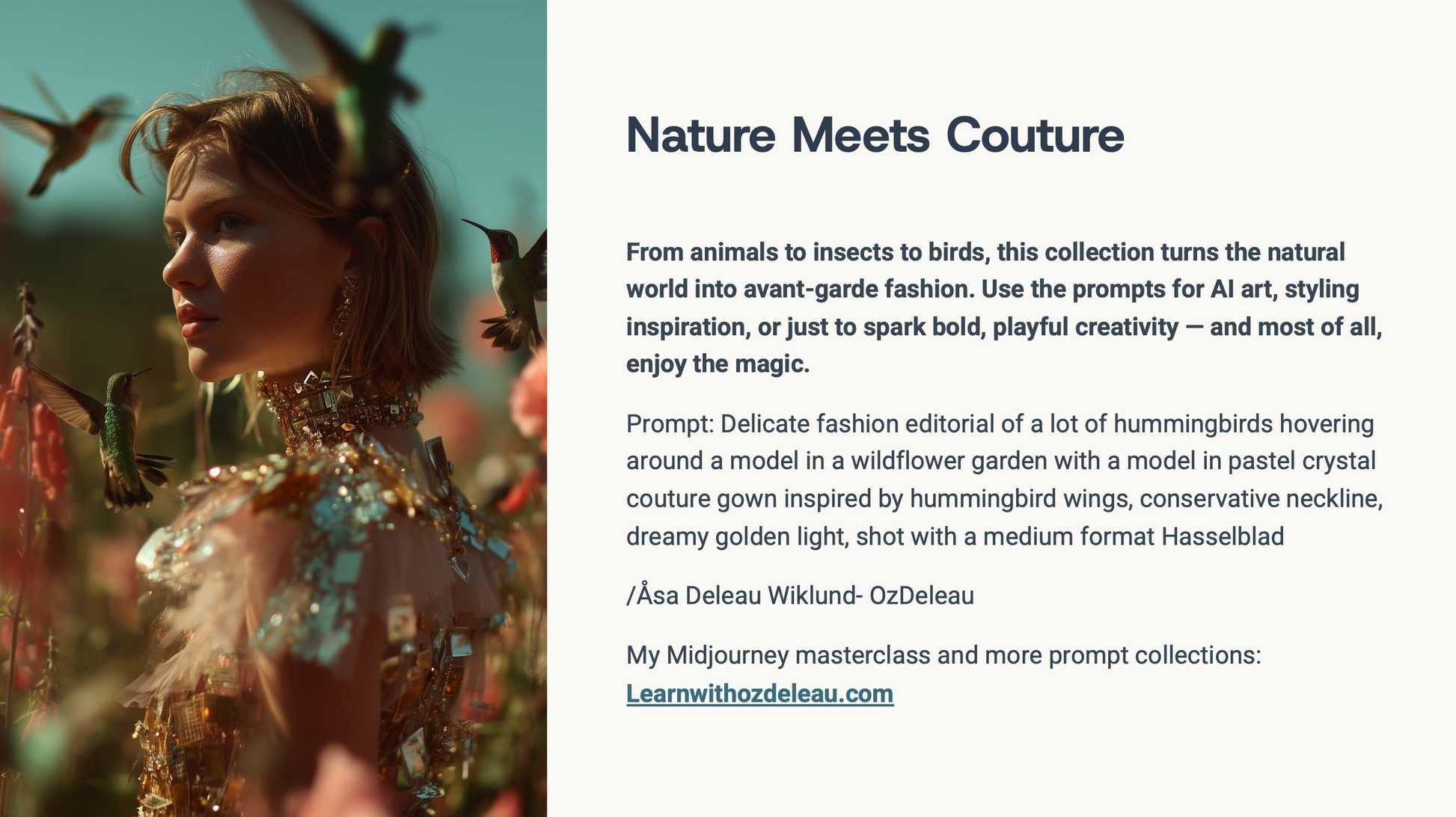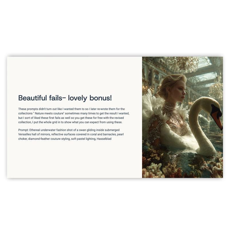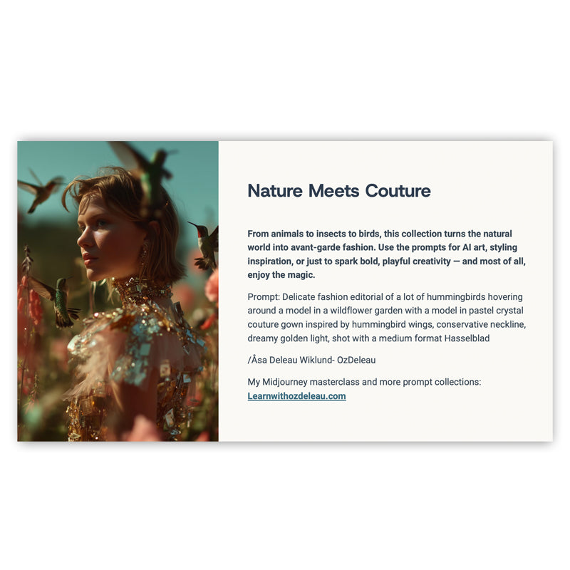 This collection of MidJourney prompts brings together animals and couture models, styled in breathtaking editorial fashion, set in urban cityscapes, enchanted gardens, and surreal underwater worlds.