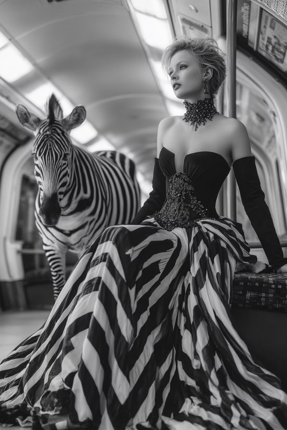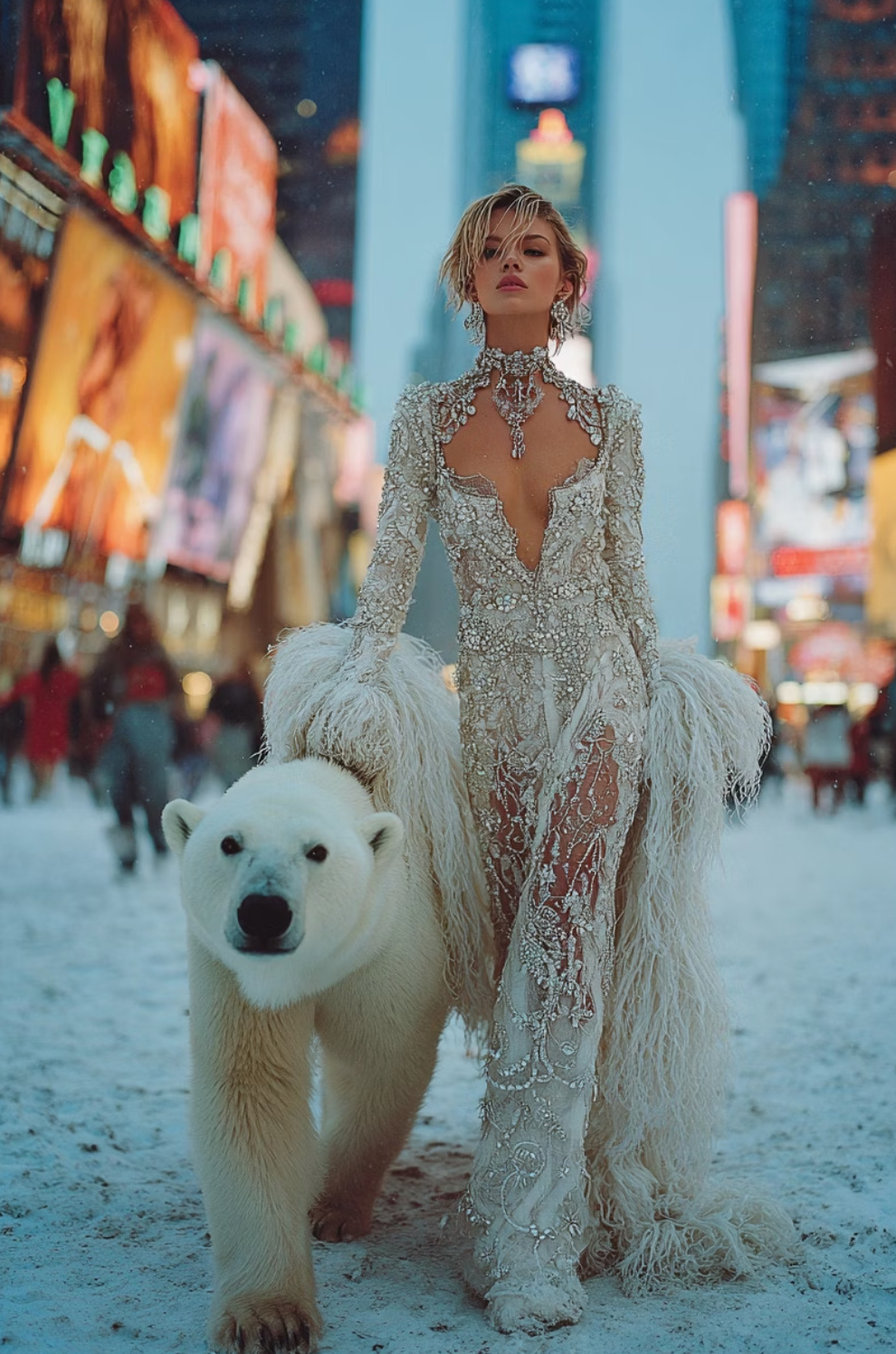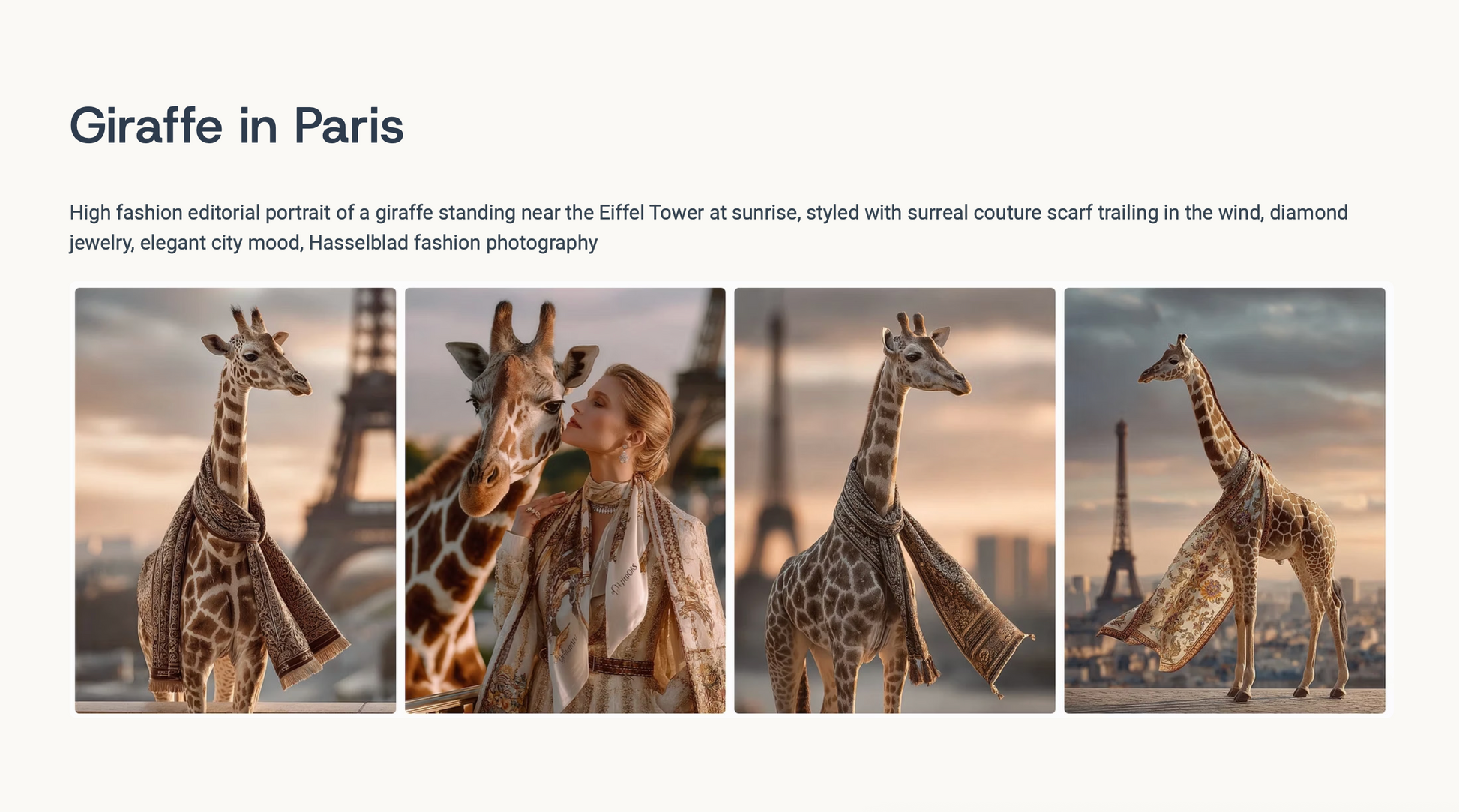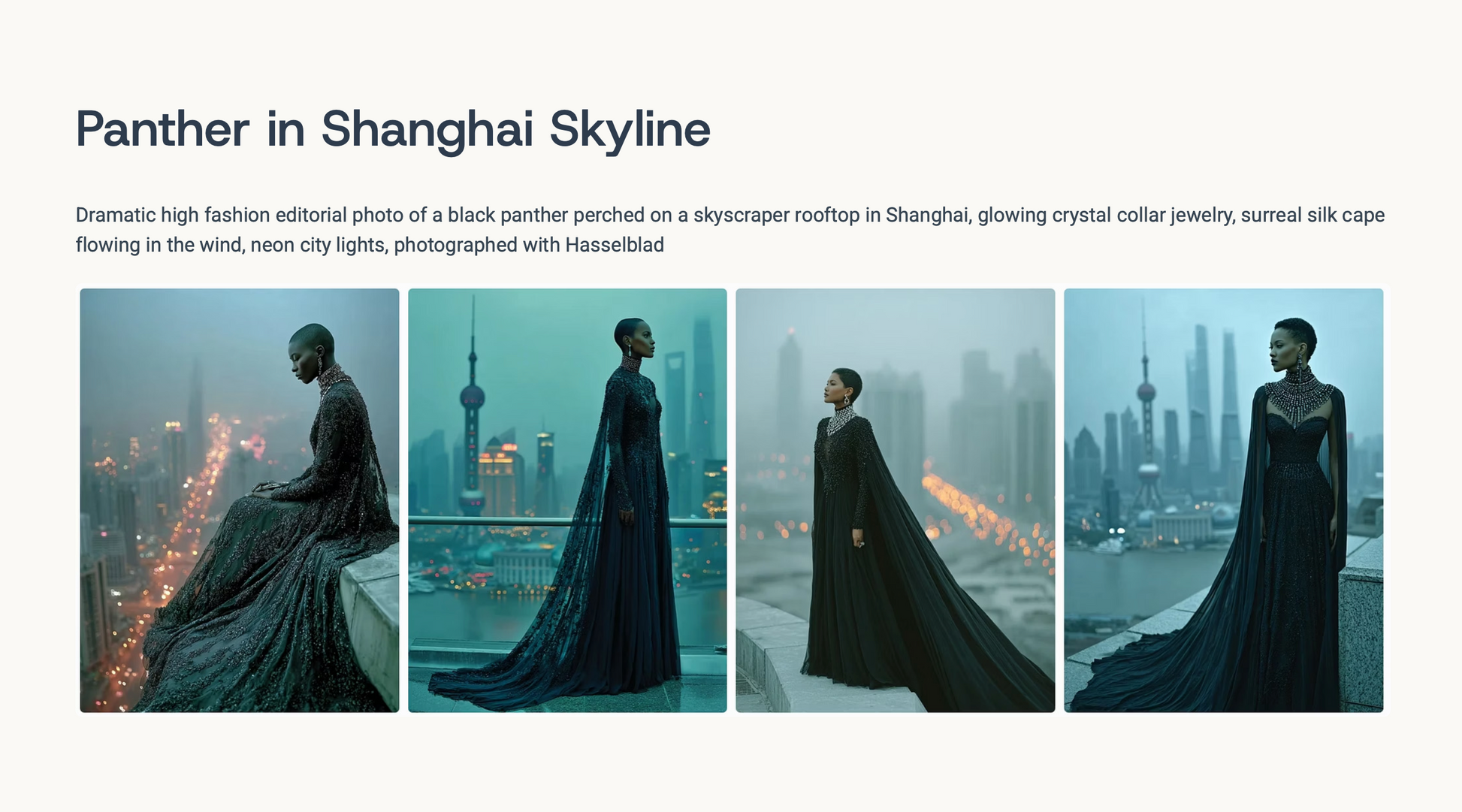 This collection of MidJourney prompts brings together animals and couture models, styled in breathtaking editorial fashion, set in urban cityscapes, enchanted gardens, and surreal underwater worlds.