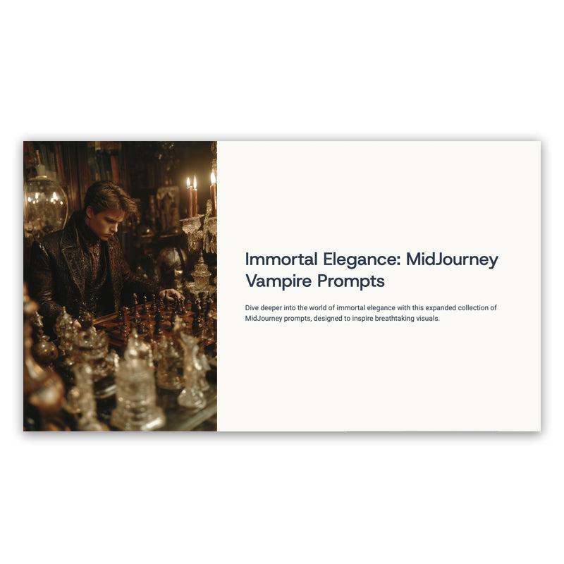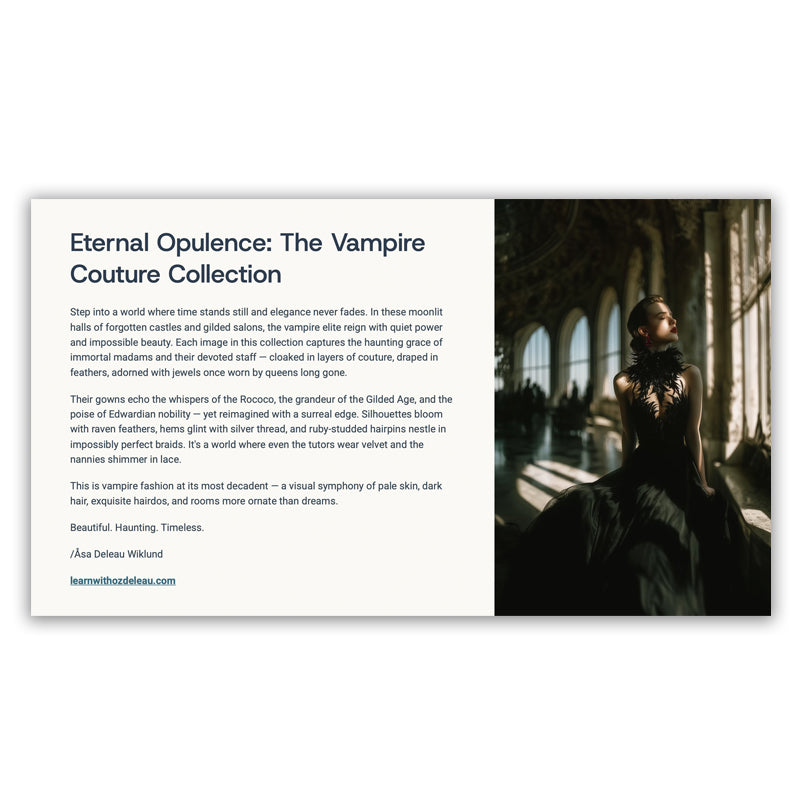 Step into the shadows of high fashion with this deluxe vampire prompt collection. Featuring 65 Couture Vampires in luxurious gowns, tailored suits, elaborate hats, and dramatic hairdos — and bonus with 40 Mixed Vampire Prompts