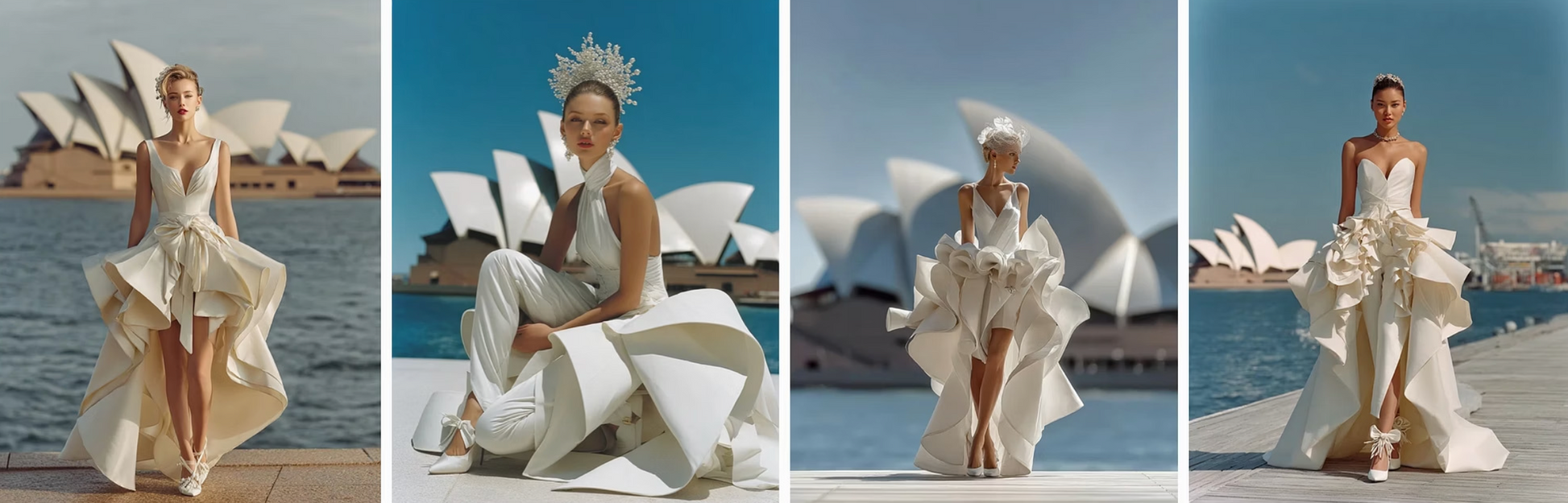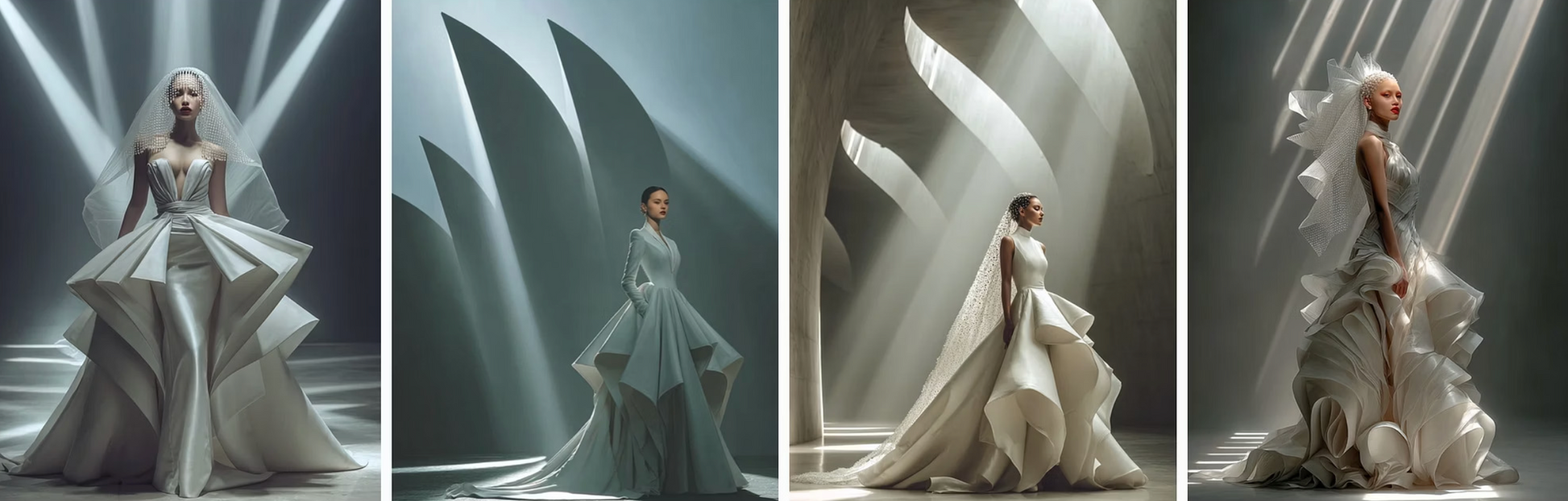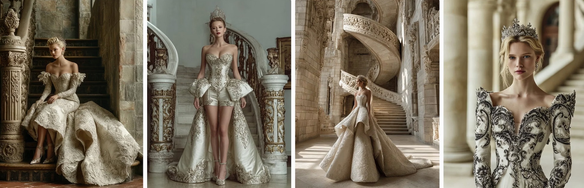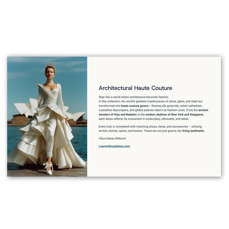 This digital collection of 60 couture prompts is inspired by architectural marvels—from brutalist monoliths to baroque curves, glass towers to ancient temples. Crafted for use with AI image generators like Midjourney, DALL·E, and others, these prompts blend the lines between structural design and high fashion.