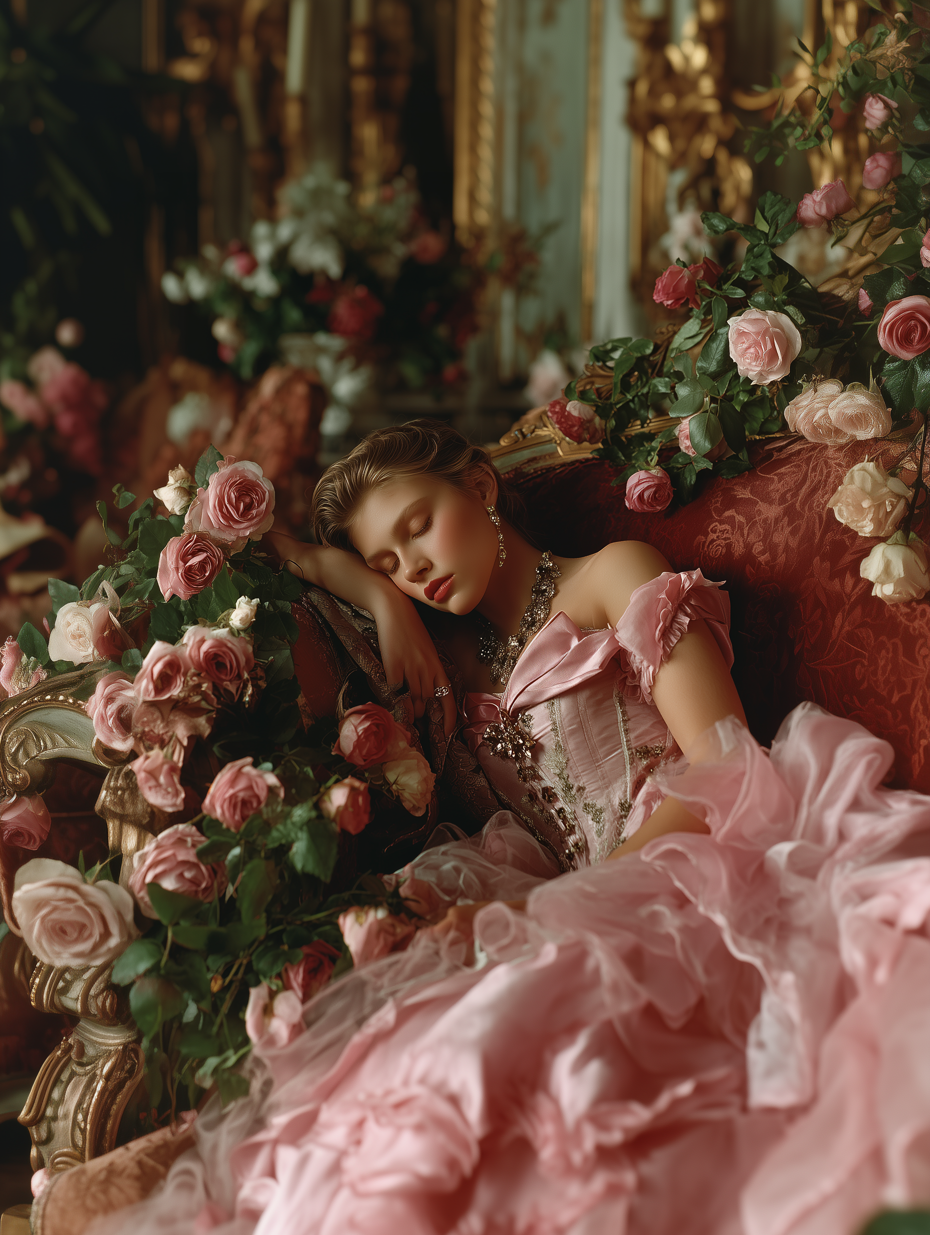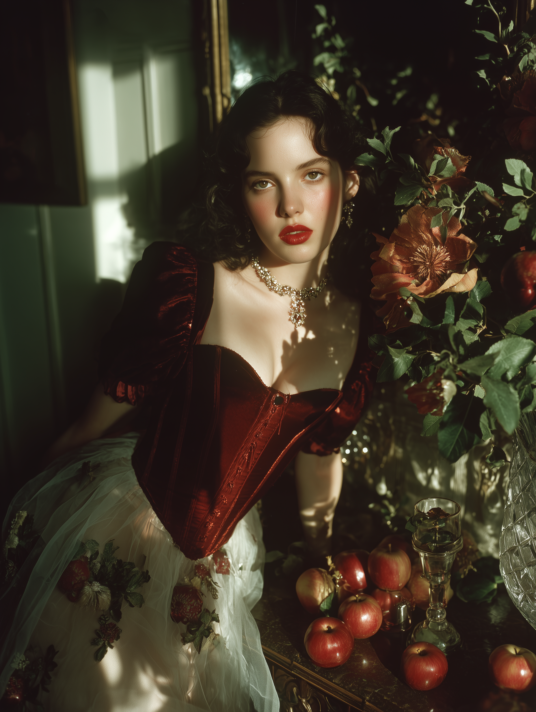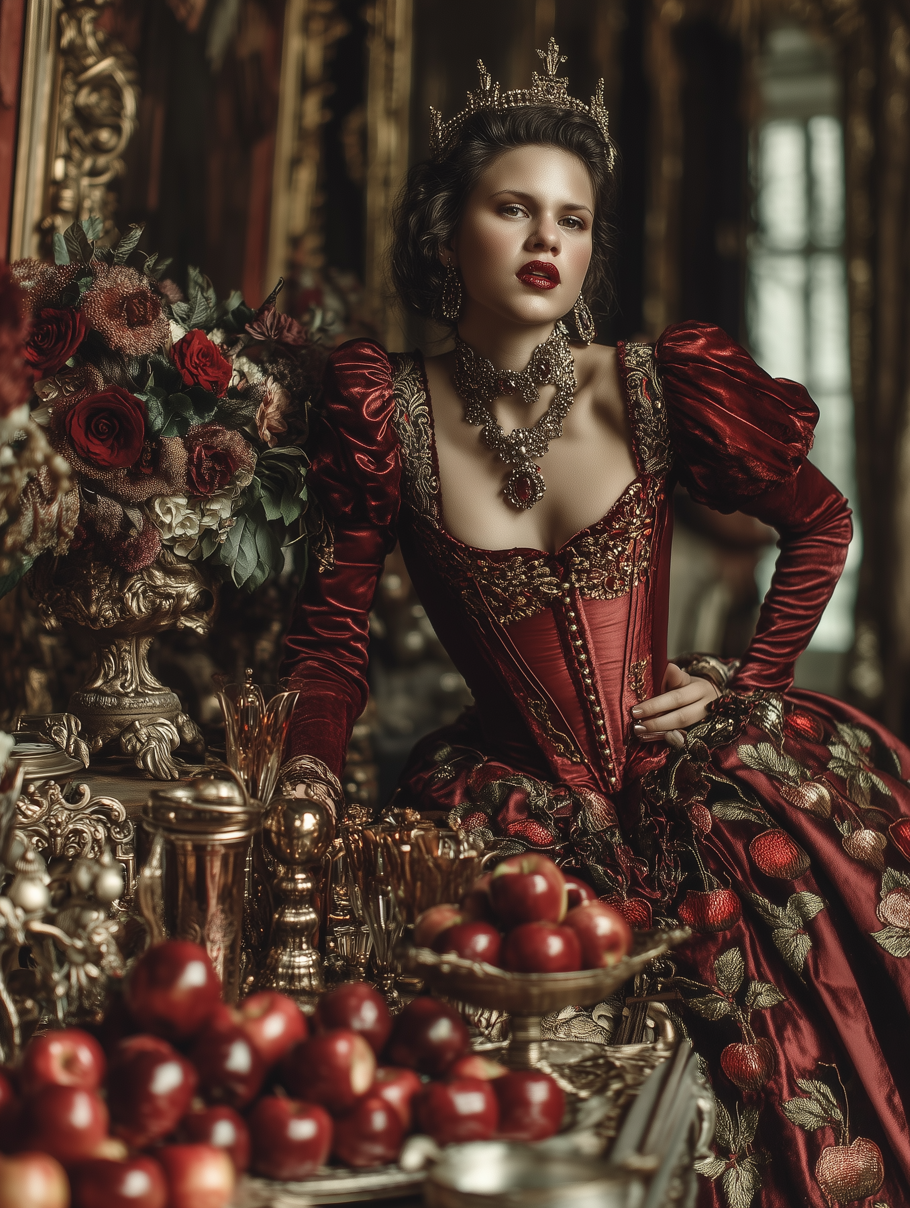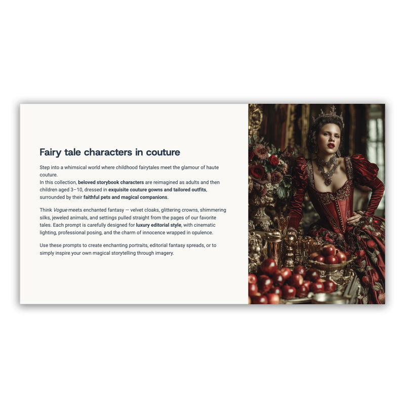 Step into a world where beloved storybook characters meet haute couture fashion. This exclusive prompt collection transforms fairy-tale icons into breathtaking editorial visions — Little Red Riding Hood in velvet gowns, Cinderella in crystal embroidery, Snow White in decadent Rococo lace, and many more.
