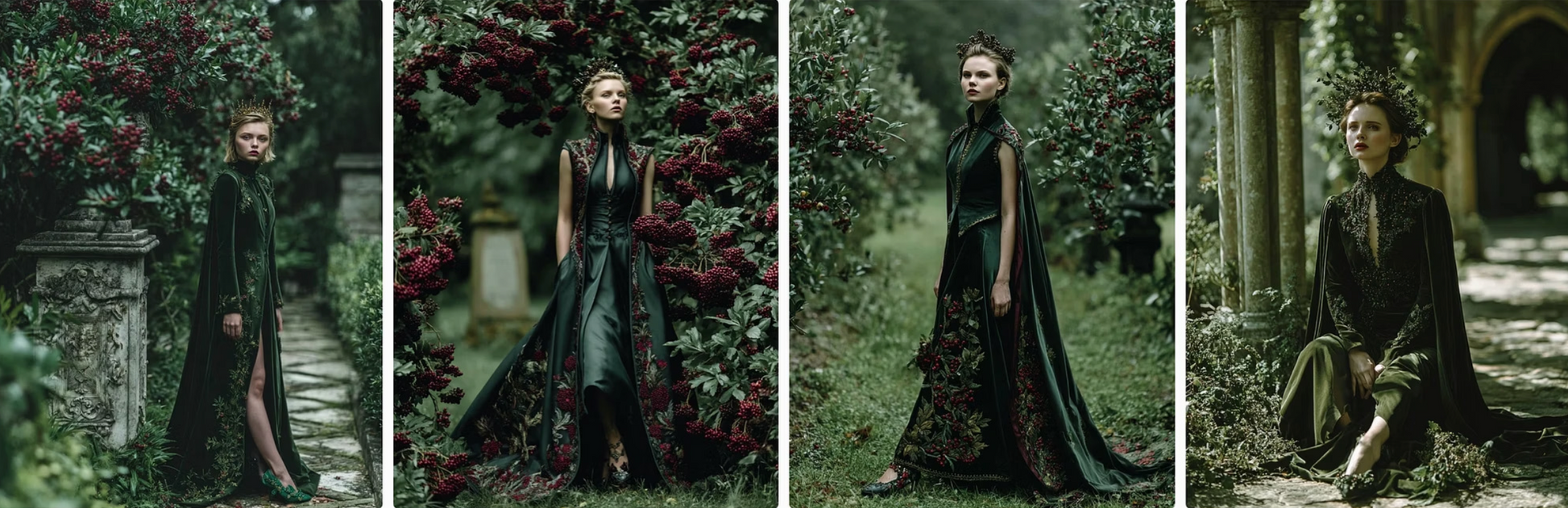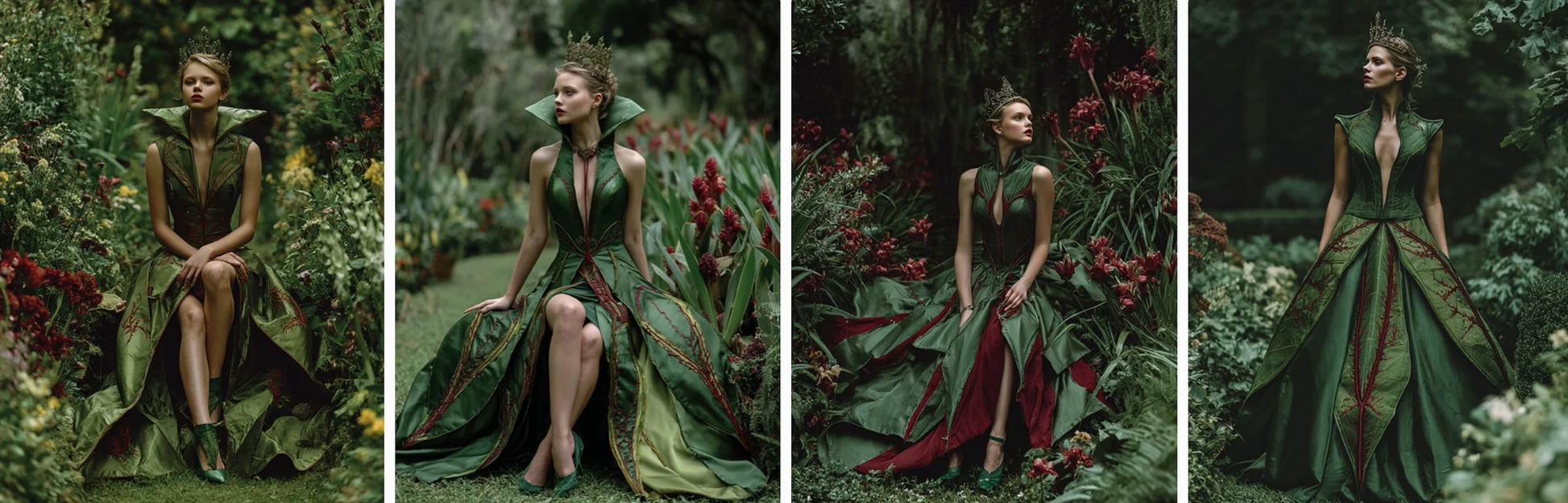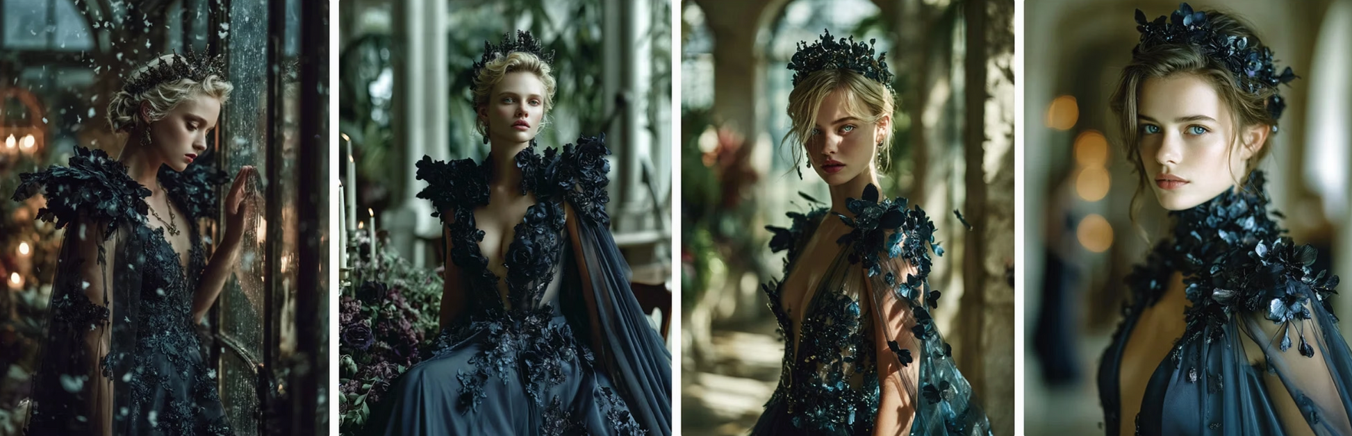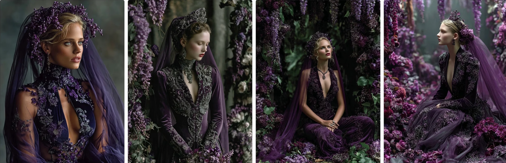 enchanted flowers into haute couture gowns. Flowing velvet nightshade, glittering