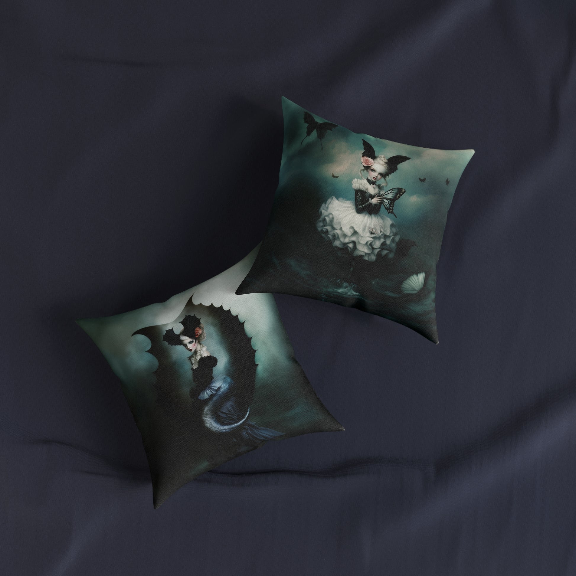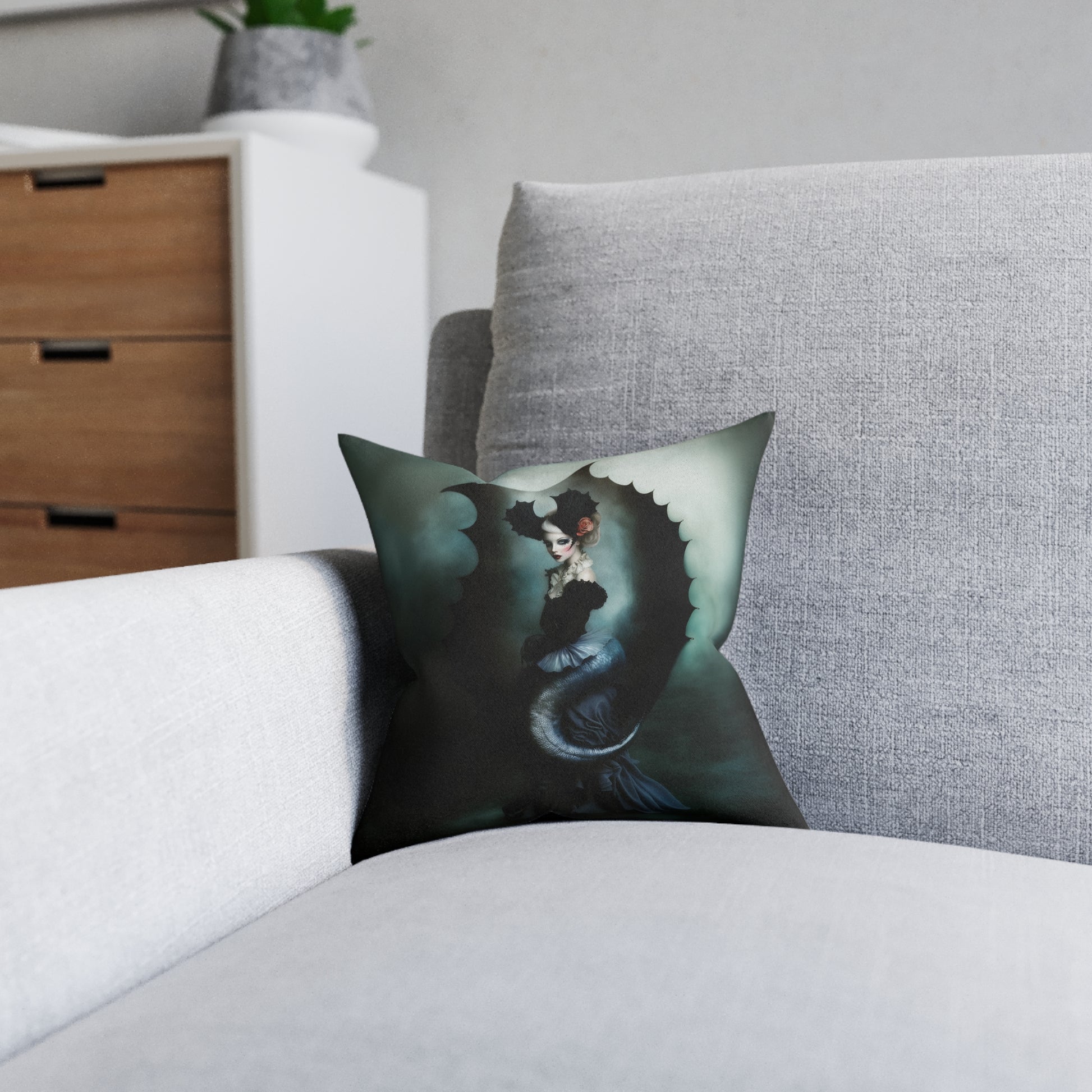 This gothic mermaid pillow features different designs on the front and back, adding a touch of mystery and elegance to your living space. Soft and plush, this square pillow is perfect for anyone looking to add a unique and artistic accent to their home decor. Ideal for those who appreciate dark, fantasy-inspired aesthetics, this pillow is perfect for Halloween, themed parties, and everyday use.