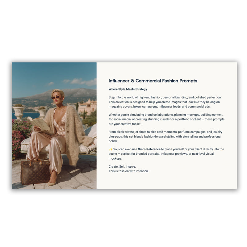 Create stunning influencer-style images with this curated collection of 75 MidJourney prompts. Designed for lifestyle branding, social media content, and commercial beauty photography, this set blends high fashion, luxury lifestyle, and influencer aesthetics.