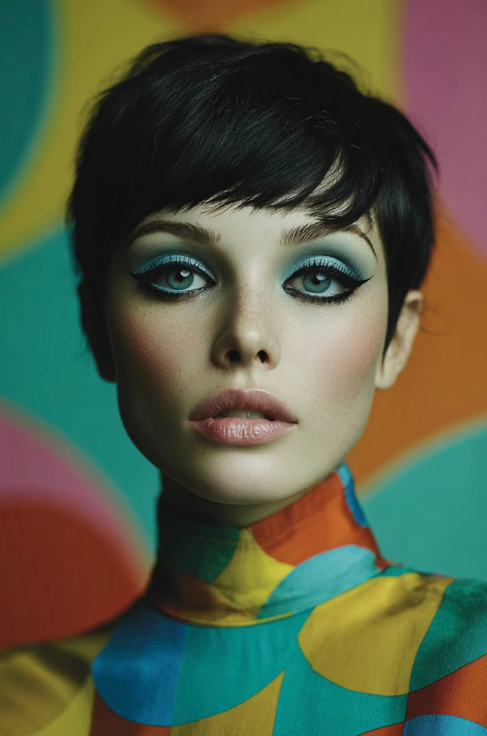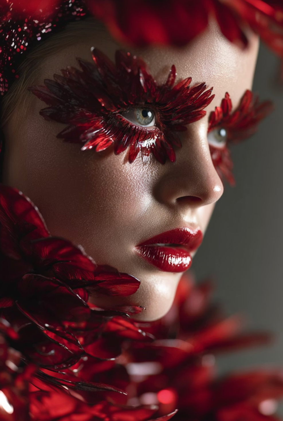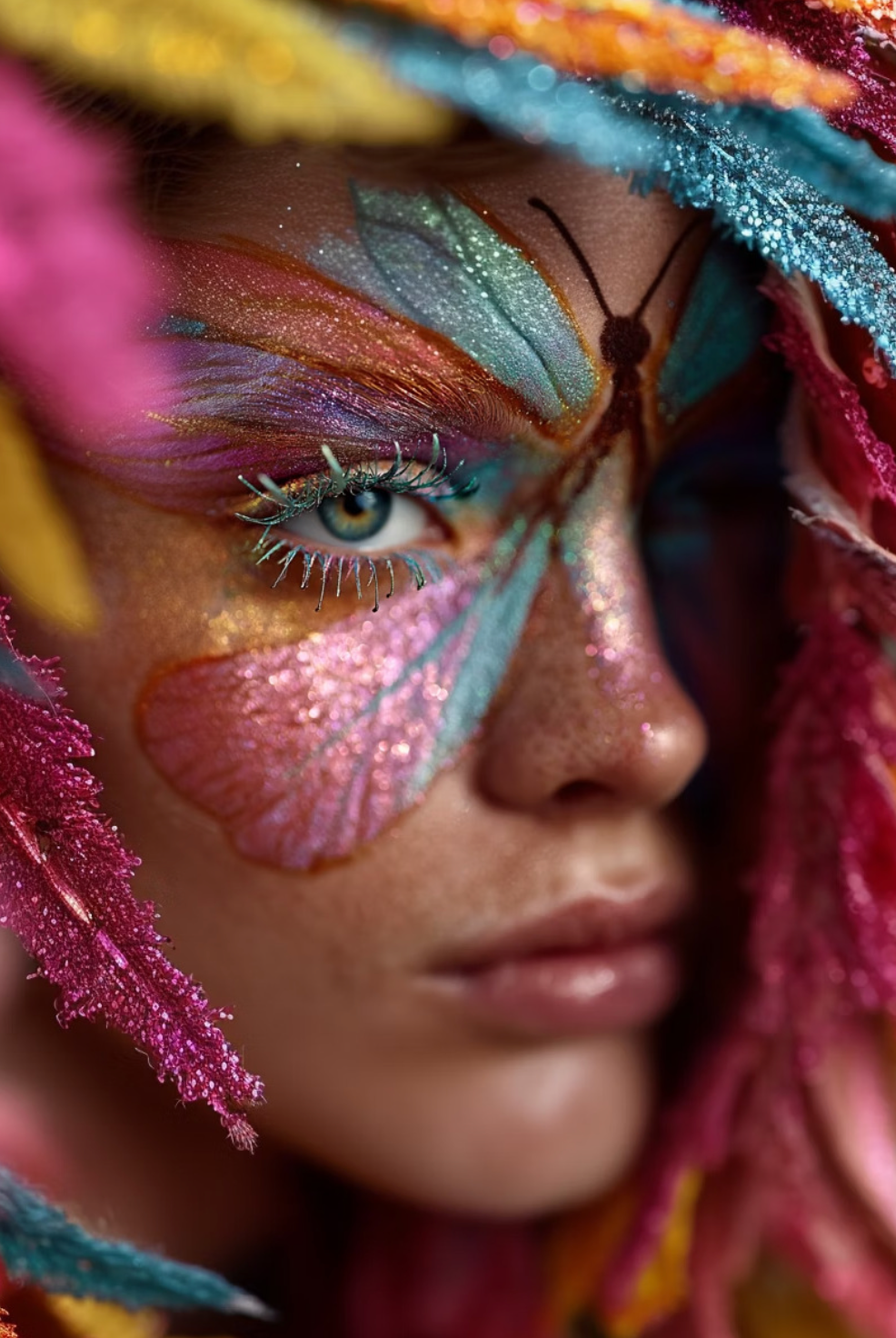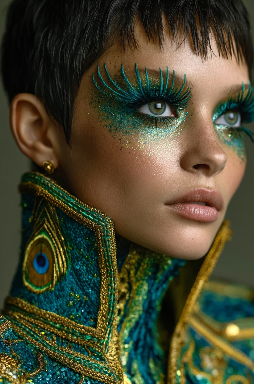 Avant-garde makeup & hair — surreal designs, geometric patterns, bold colors, jewel embellishments, feathered and sculptural hair, futuristic editorial styling
