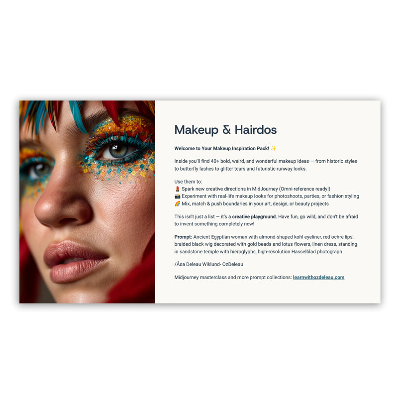 This collection takes you on a visual journey through makeup and hairstyling across time — from the elegance of ancient civilizations to the extravagance of Rococo, the bold looks of the 1920s, the glamour of Hollywood’s Golden Age, and the rebellious styles of the late 20th century. Combined with modern fashion makeup and avant-garde artistic creations, this set of 100+ MidJourney prompts is a treasure trove for creatives.