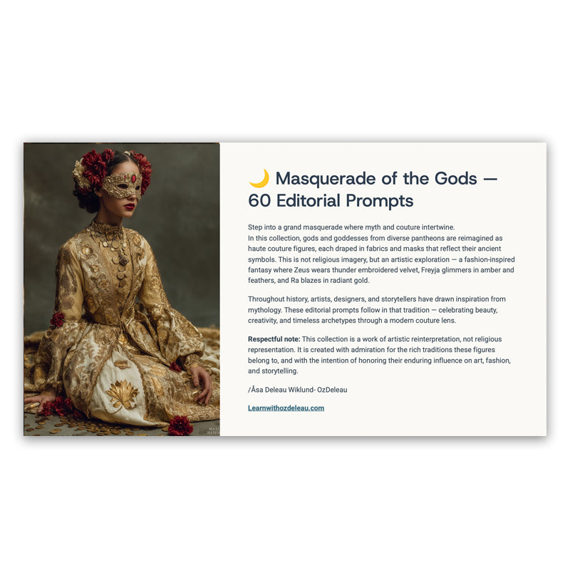 Step into a divine masquerade where gods, goddesses, and mythical beings arrive dressed in breathtaking haute couture. This unique prompt collection blends mythology, fantasy, and high fashion into a series of unforgettable editorial creations.