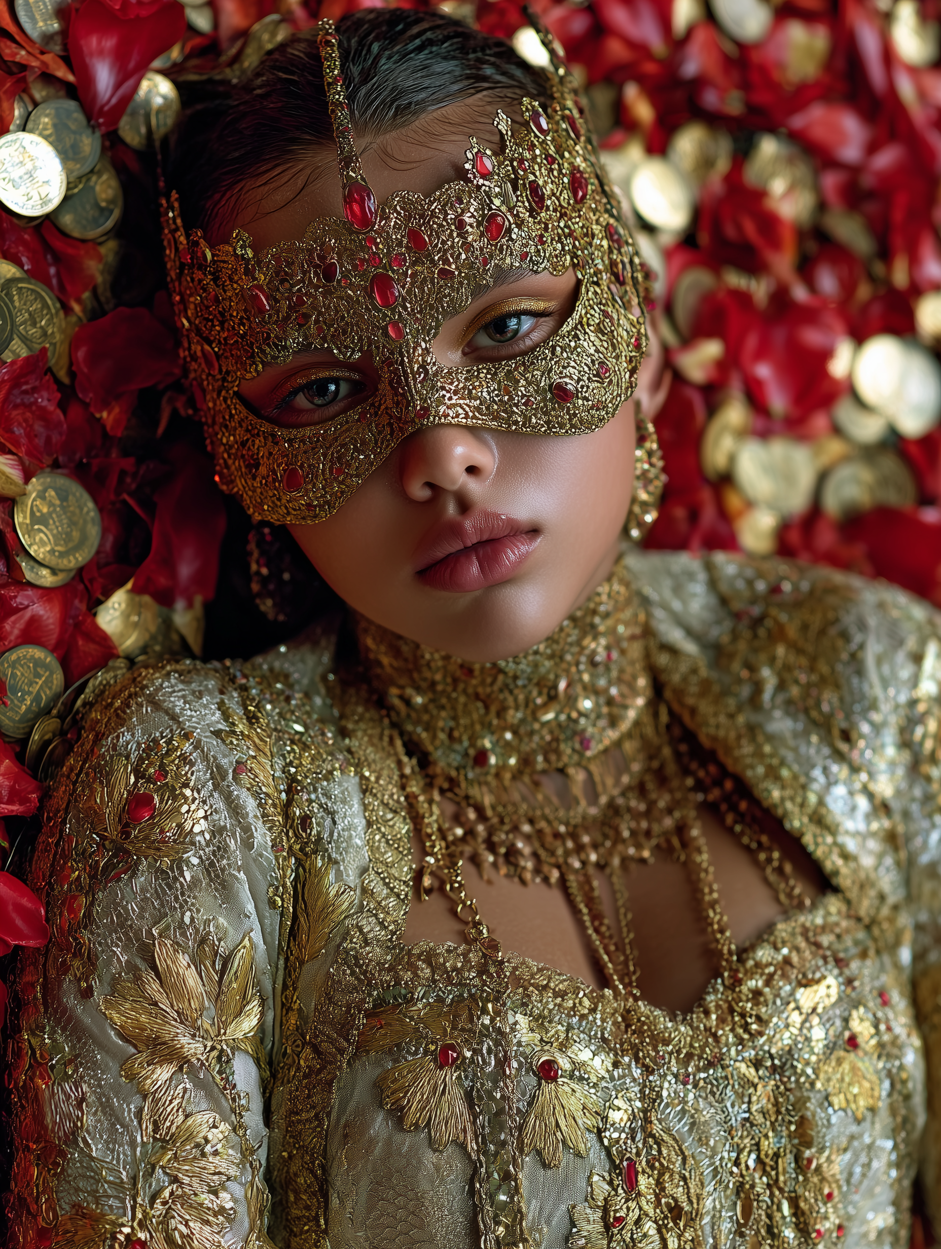 🎭 Opulent masquerade themes with jeweled masks, feathered headpieces, and dramatic stage settings