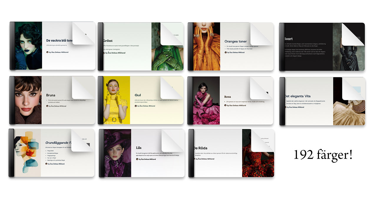 -11 PDF:er med totalt 192 olika färger för att kunna prompta exakta toner, hittade själv nya favoriter i processen, alla illustrerade med bild på modell och på bil för att se hur programmet tolkar färgerna.