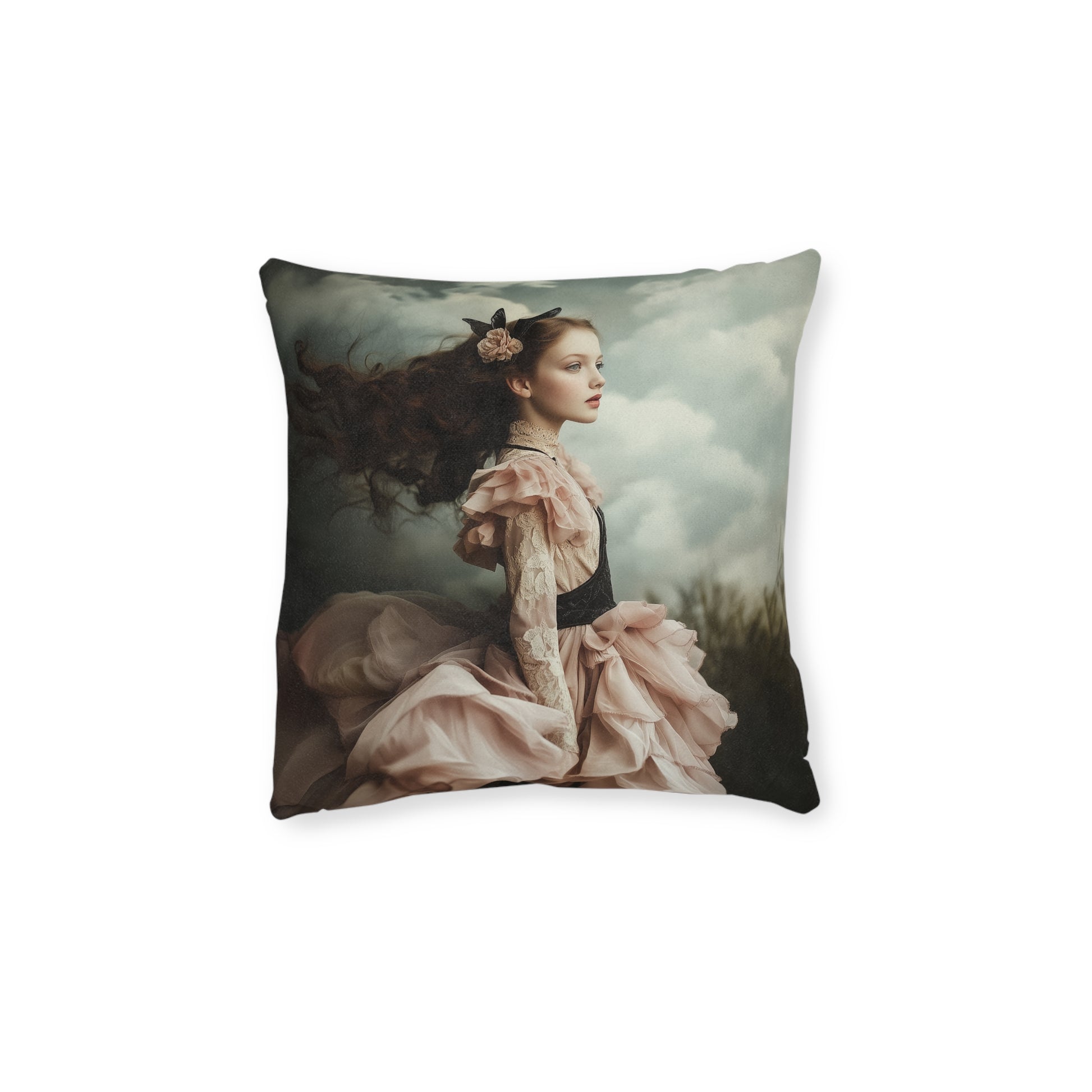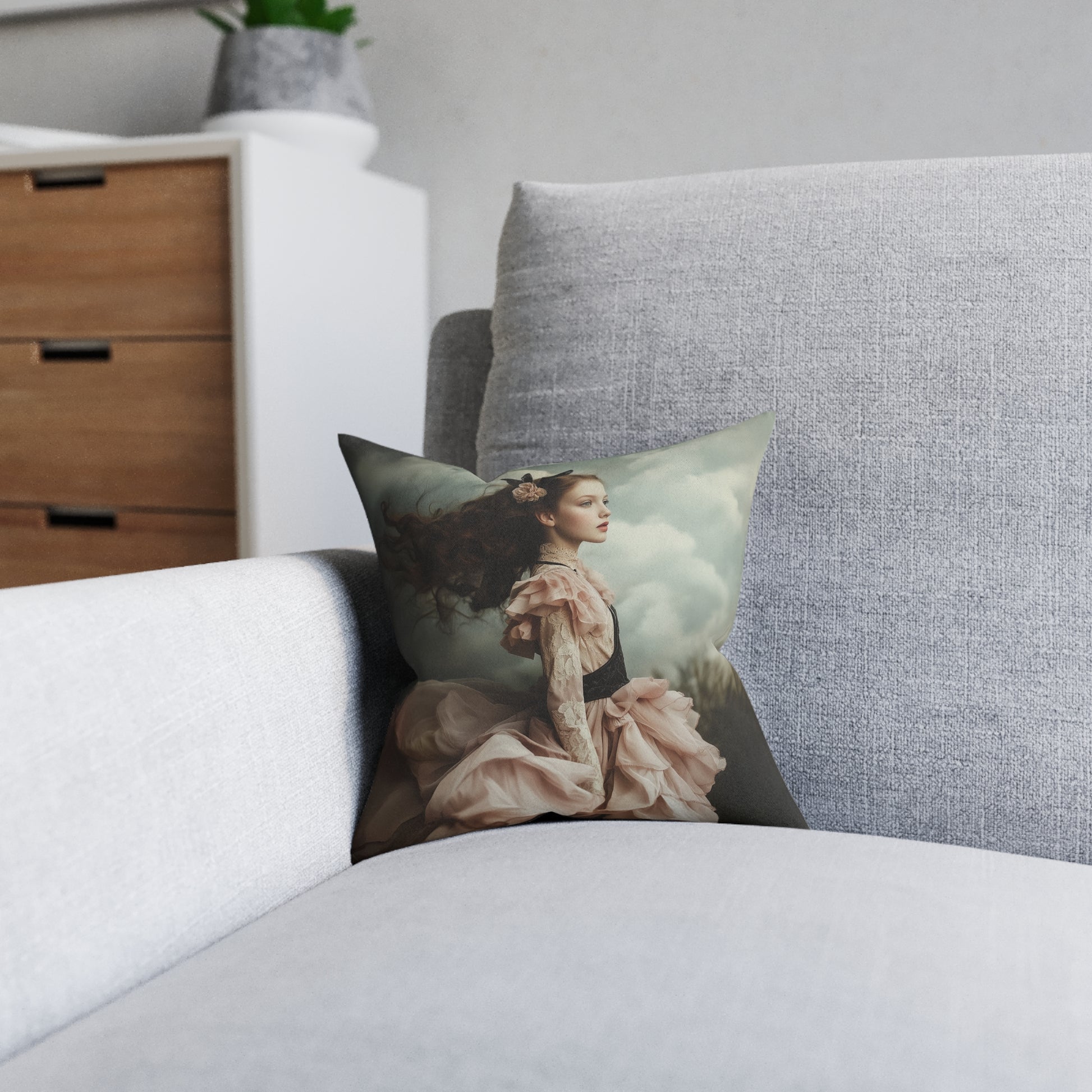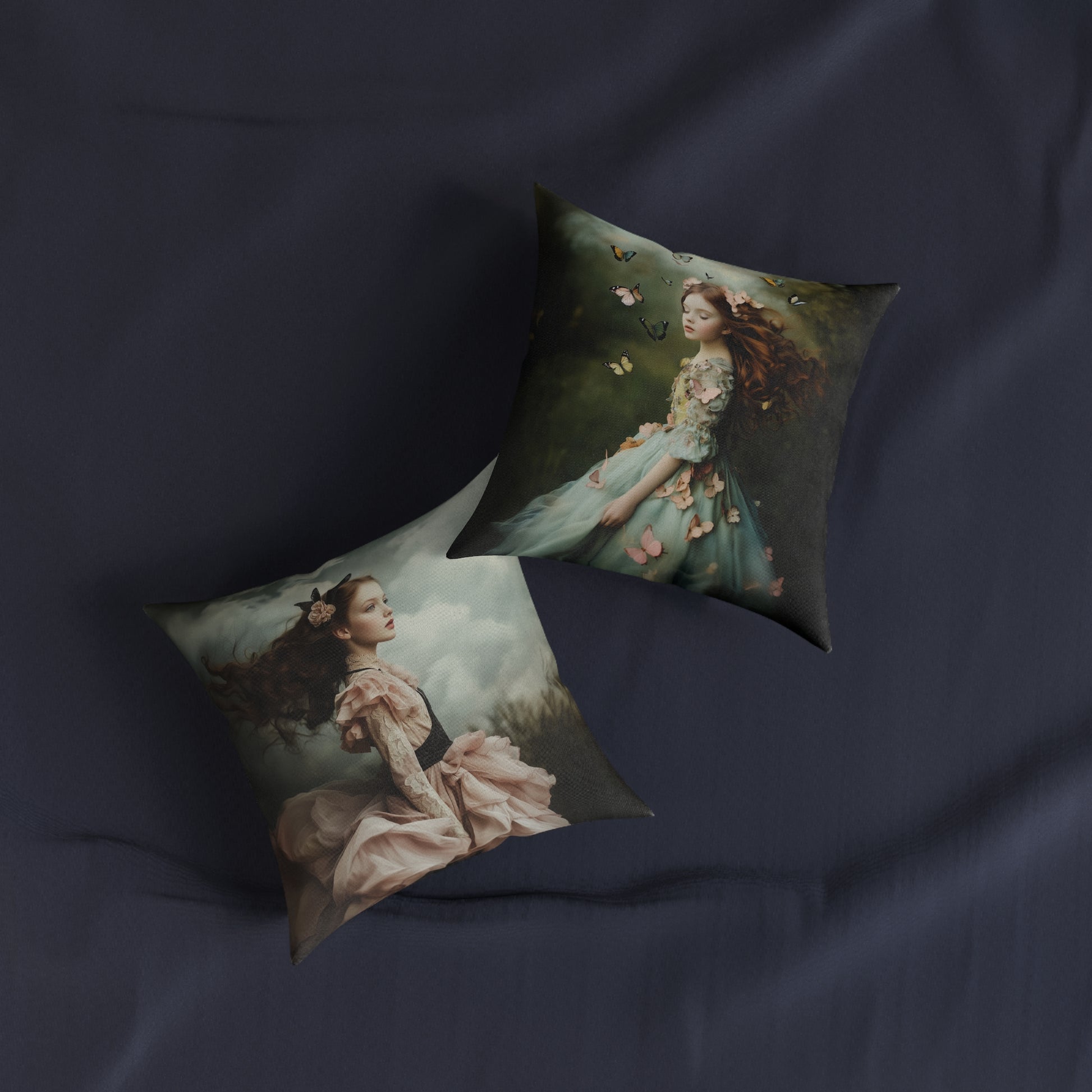 A square pillow featuring a girl in a pretty dress with butterflies, with one side in pink dress and the other in blue dress. Perfect for a little girl's room, adding a whimsical and dreamy atmosphere. This pillow is soft to the touch, vibrant in colors