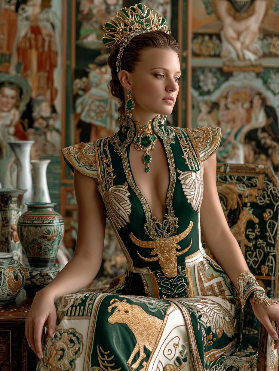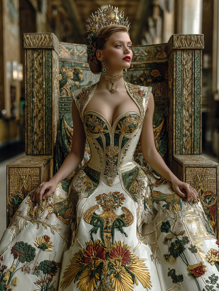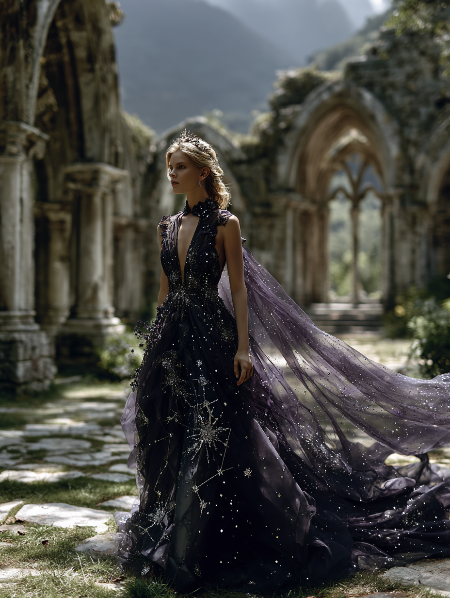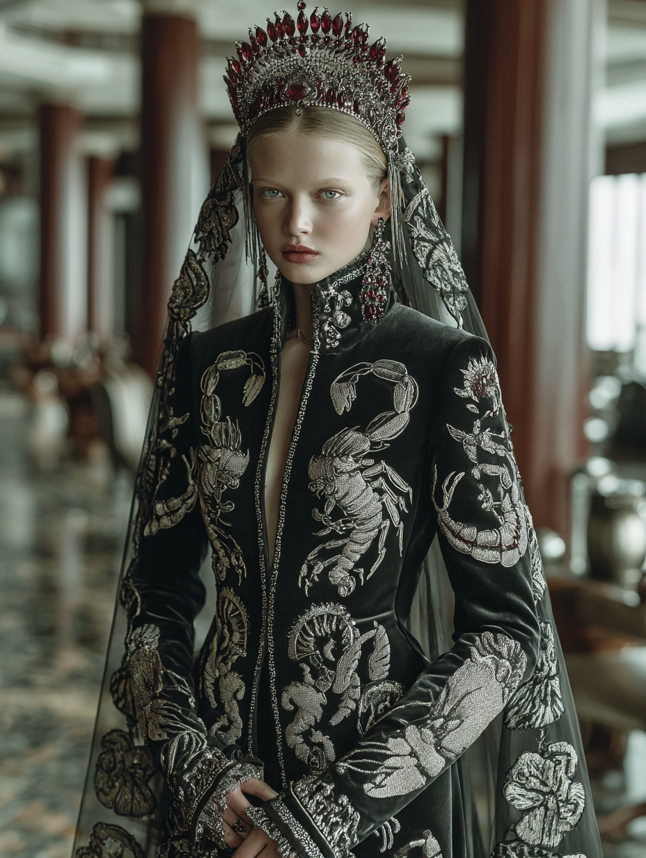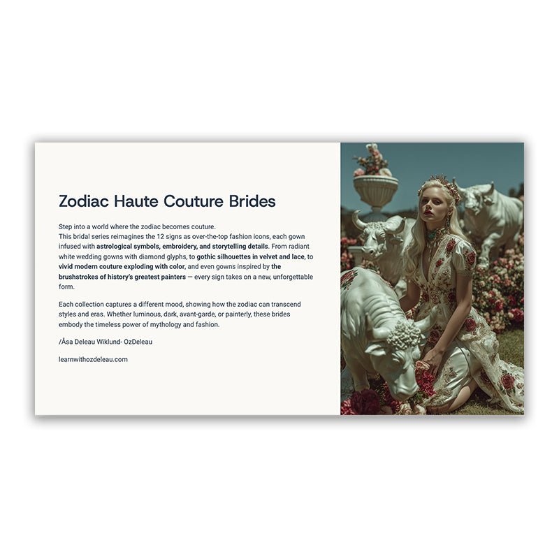Each pack is fully illustrated with MidJourney images, showing exactly how every sign comes to life. Expect couture gowns, elaborate wigs and tiaras, embroidery of zodiac glyphs, symbolic pets, and dramatic settings — from palaces and mirrored salons to enchanted gardens and modern runways.
